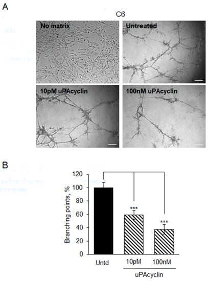 Inhibition by uPAcyclin is observed also when seeding C6 cells under the conditions described in Figure 6 and monitoring them for VM formation. When exposed to 10 pM or 100 nM uPAcyclin, the branching point number is inhibited by 40% and 60%, respectively (Figure 7A,B).