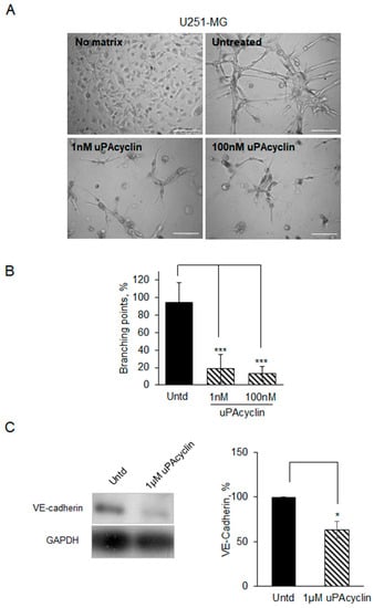 In the following experiment, the expression of VE-cadherin, that is, a marker of vascular structure formation, is evaluated in the presence and in the absence of uPAcyclin. To this end, U251-MG GBM cells were seeded onto GeltrexTM in the absence of serum and monitored for the formation of vascular-like structures. The cells started extending protrusions and forming contact structures after 8 h, and tube formation progressively increased after 24 h, whereas, in the presence of 1 nM or 100 nM uPAcyclin, the branching number per field decreased to 20% and 15%, respectively. This reveals a high sensitivity to the inhibition by uPAcyclin (Figure 8A,B). After 24 h, the expression of VE-cadherin was analyzed by extracting vascular-like cells from the matrix by enzymatic digestion. The recovered cells were lysed and subjected to Western blotting analysis. Cells undergoing VM showed the 130 KDa VE-cadherin band (Figure 8C, right panel). In contrast, when treated with uPAcyclin, the extent of VE-cadherin expression was markedly reduced (Figure 8C, left panel).