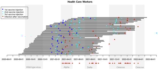 Chronological waves of SARS-CoV-2 infection in France and dates of vaccination and of breakthrough SARS-CoV-2 infections in HealthCare Workers (HCWs). The 41 HCWs with reported SARS-CoV infection despite vaccination are reported in 41 rows: horizontal bars correspond to the time between inclusion and the end of participation in the study, blue squares correspond to vaccine injections, and red triangles correspond to reported dates of COVID infection.