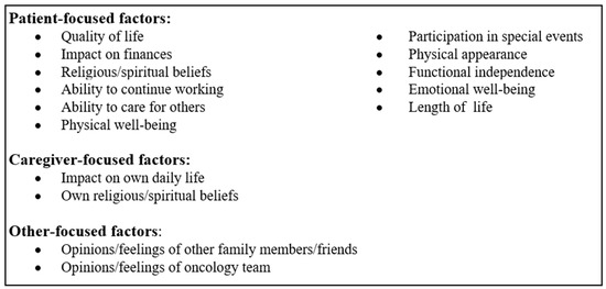 - CancerCare. Cancer Caregivers: National Research Report on Shared Treatment Decision-Making; CancerCare: New York, NY, USA, 2022; Available online: https://media.cancercare.org/documents/272/original/CancerCare_DecisionMakingReport_20220715.pdf (accessed on 5 July 2023).