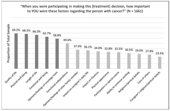 APA StyleBechthold, A. C., Azuero, A., Puga, F., Ejem, D. B., Kent, E. E., Ornstein, K. A., Ladores, S. L., Wilson, C. M., Knoepke, C. E., Miller-Sonet, E., & Odom, J. N. (2023). What Is Most Important to Family Caregivers When Helping Patients Make Treatment-Related Decisions: Findings from a National Survey. Cancers, 15(19), 4792. https://doi.org/10.3390/cancers15194792