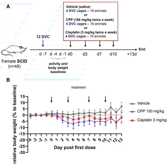 Seven days before the first injection (noted Day −7), mice were transferred from individually ventilated cages to the DVC® system (Figure 1). On Day 0, cages were randomized into 3 groups, without reorganization of the individuals to avoid additional stress, and mice from these groups received treatment with one of the compounds or a vehicle control on a biweekly basis for a total of four injections. The choice of sample size was based on previous studies and standard protocols carried out in-house to compare clinical and DVC® parameters. Cisplatin (cis-diammineplatinum (II) dichloride) was obtained from VWR (Radnor, PA, USA) and prepared at 3 mg/kg. Cyclophosphamide monohydrate was obtained from Thermo Fisher Scientific (Waltham, MA, USA) and prepared at 150 mg/kg. All substances were dissolved in a sterile 0.9% NaCl solution (CDM Lavoisier, Paris, France) and injected intraperitoneally (i.p.) with a volume of 0.25 mL. Animals in the control group received an injection of the corresponding vehicle. The doses used were based on previously published work [28] and pilot studies evaluating the highest doses that could be administered without lethality or a decrease in body weight > 15%, while demonstrating anti-tumor efficacy in murine tumor models.
