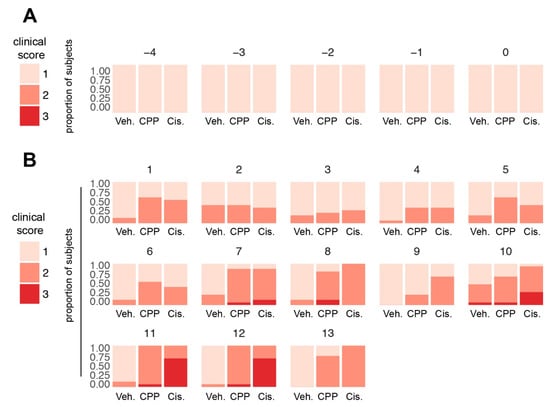 Distribution of the clinical scores in the three study groups (n = 48) for (A) days corresponding to the baseline activity (Days −4 to −1) plus the day of the first treatment administration, Day 0; and (B) days following the first treatment administration. A two-way ANOVA-TYPE was applied to assess global effects with treatment group, day and group x day interaction; p < 0.0001, followed by a Bonferroni–Holm adjustment for each day and a Hochberg correction for each comparison to account for multiplicity across treatment and time. These statistics are summarized in Supplementary Table S1. Veh., vehicle; CPP, cyclophosphamide; Cis., cisplatin.