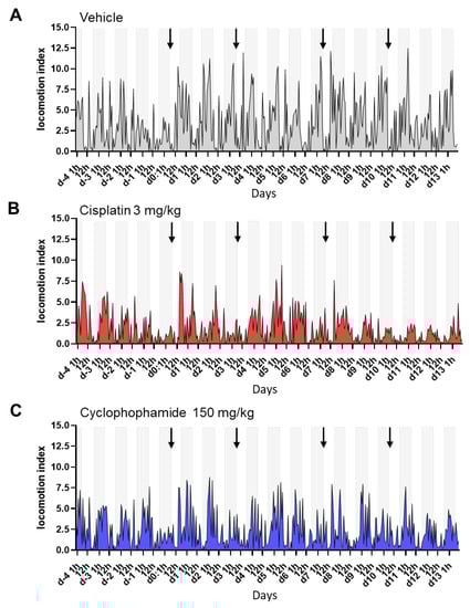 DVC® locomotion index profile revealed alterations in animal activity upon chemotherapy intervention. Locomotion activity profiles generated from locomotion indexes in representative group-housed DVC® cages from each treatment group: (A) vehicle, (B) cisplatin, (C) cyclophosphamide. Values were calculated from measurements collected over 1 h intervals. The gray areas correspond to the dark phase. The arrows indicate the days of injection.