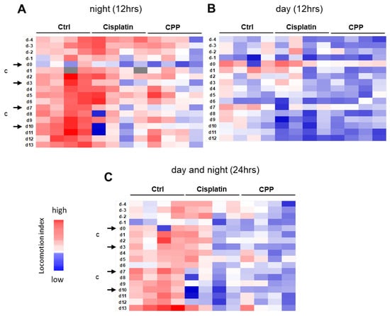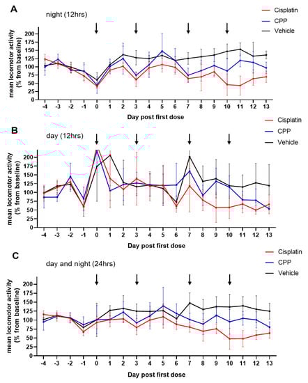 Locomotion activity change revealed significant adverse effects of cisplatin on animal activity. Curves depicting the nocturnal and diurnal activity (night and day time activity). Locomotion activity change is presented as a percent of baseline ± SD, (A) at night (two-way ANOVA; study group (p < 0.0001), time (p = 0.0002), time by study group interaction (p = 0.0438)); (B) daytime (two-way ANOVA; study group (p = 0.1204); time (p < 0.0001), time by study group (p = 0.0317)); or (C) the entire day (two-way ANOVA; study group (p < 0.0001), time (p = 0.0002), time by study group interaction (p = 0.05)). Statistical comparisons for the different days are summarized in Supplementary Table S1.