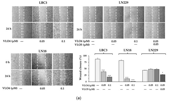 Cell migration was investigated in the wound healing assay. VLO4 at concentrations of 0.05 and 0.1 µM after 24 h of incubation was able to significantly inhibit LBC3 and even more LN18 cell migration, whereas no effect on the LN229 cells was observed (Figure 4a). Moreover, the addition of VLO4 to the LBC3 and LN18 cell lines caused their detachment to varying degrees, most notably in LN18 cells treated with a higher concentration of VLO4 (0.1 µM). Under these conditions and at these concentrations, VLO4 did not detach LN229 cells.