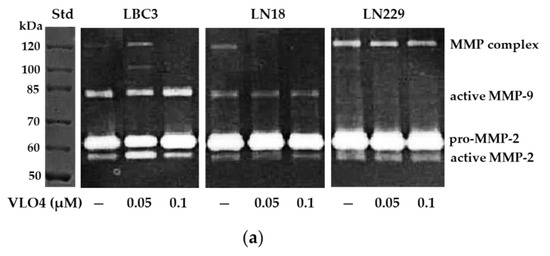 Representative gelatin zymogram (a). MMPs were assayed in the medium of glioblastoma cell lines treated with VLO4 disintegrin. MMPs are indicated as pro-MMP-2, active MMP-2, active MMP-9, and MMP complex (130 kDa). The molecular weight standard (Std) PageRuler Unstained Protein Ladder, ThermoFisher Scientific, Waltham, MA, USA, is shown. The bars (b) represent the results of MMP activity (in arbitrary units) as the mean ± SD from three independent experiments based on densitometry measurement (the values of these measurements are included in the Supplementary Materials in Figure S6); ** p < 0.01, *** p < 0.001, vs. control (untreated cells).