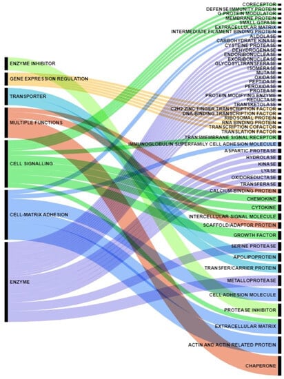 Proteins Functions—A Global Core Biodata Resource, Panther Classification System (https://pantherdb.org/, accessed on 11 June 2023), classified the gene dataset for functions. Proteins secreted by pancreatic cancer cells were classified as having a general function (left column) or a specific function (right column). An Alluvial plot (https://www.mapequation.org/alluvial/, accessed on 28 June 2023) was used to depict the classifications. Furthermore, percentages of secreted proteins having common general functions are reported in the left column. A color code was used for each general function. In the column, the most represented protein functions are in the plot’s lower part.