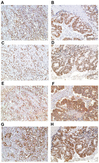 The representative figures of pMMR status. Positive for MLH1 (A), MSH2 (C), MSH6 (E) and PMS2 (G) in the same case. Positive for MLH1 (B), MSH2 (D), MSH6 (F) and PMS2 (H) in the same case. Immunohistochemical staining; original magnification ×200; scale bar, 150 μm.