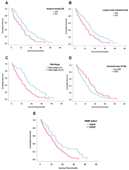 Survival (Kaplan–Meier) analysis of clinicopathological features and MMR proteins. (A) Surgical margin (R). (B) Lymph node metastasis. (C) TNM stage. (D) Chemotherapy treatment (CMT). (E) MMR status.