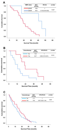 Our aim was to evaluate the chemotherapeutic (CMT) effects on CCA patients who showed dMMR. Several reports suggest that dMMR can be applied with clinical benefit for treatments such as chemotherapy and immunotherapy in several cancers, especially colorectal cancer [17,18,19,20,21]. All CCA patients received surgical resection and 29.9% of patients received adjuvant chemotherapy. Therefore, surgical patients were separated into those receiving CMT and those not receiving CMT. dMMR patients who received CMT had significantly better survival rates than patients who received surgery alone (MST = 23 vs. 13 mo., HR = 0.28 (95% CI: 0.10–0.81), p = 0.012) (Figure 4B), while there was no statistically significant difference on survival in pMMR patients who received CMT and surgery alone (MST = 15.6 vs. 11.7 mo., HR = 0.87 (95% CI: 0.52–1.44), p = 0.581) (Figure 4C).