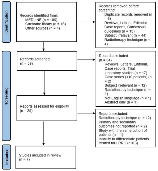 - Guren, M.G.; Undseth, C.; Rekstad, B.L.; Brændengen, M.; Dueland, S.; Spindler, K.-L.G.; Glynne-Jones, R.; Tveit, K.M. Reirradiation of Locally Recurrent Rectal Cancer: A Systematic Review. Radiother. Oncol. 2014, 113, 151–157. [Google Scholar] [CrossRef] [PubMed]