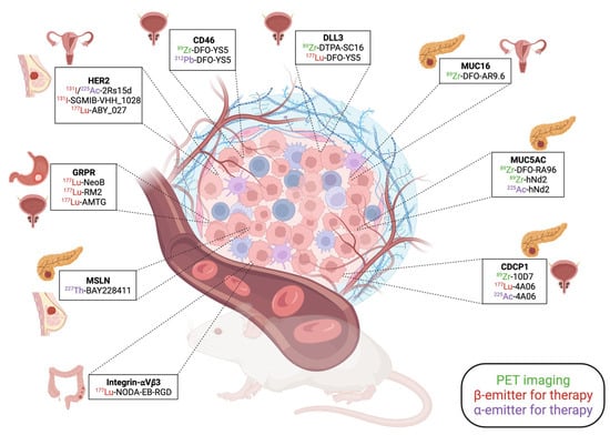 - Sharma, S.K.; Mack, K.N.; Piersigilli, A.; Pourat, J.; Edwards, K.J.; Keinänen, O.; Jiao, M.S.; Zhao, H.; White, B.; Brooks, C.L.; et al. ImmunoPET of Ovarian and Pancreatic Cancer with AR9.6, a Novel MUC16-Targeted Therapeutic Antibody. Clin. Cancer Res. 2022, 28, 948–959. [Google Scholar] [CrossRef] [PubMed]