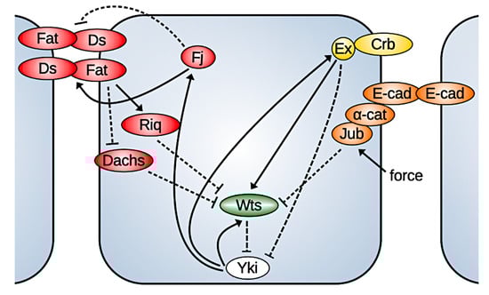 The Hippo pathway is a highly conserved core kinase cascade that is regulated by many upstream factors and in turn regulates transcription factors involved in cell growth, proliferation, and apoptosis. The key effector in the Hippo pathway is Yorkie (Yki), a co-transcription factor whose nuclear localization is controlled by the kinase Warts (Wts). When Yki is phosphorylated by Warts, it cannot enter the nucleus. In the nucleus, Yki acts by binding to transcription factors such as Scalloped (Sd) to activate the expression of cyclin E, myc, DIAP1, and bantam, which control cell proliferation [16], and it also controls the expression of genes upstream in the Hippo pathway, such as Warts, Expanded, Fat, Ds, Merlin, Kibra, and four-jointed (Fj) (compared in Figure 3). Since Expanded (Ex), Merlin (Mer), Kibra, Fj, and Wts are involved in the regulation of Yki via the Hippo signaling, this establishes a negative feedback loop to regulate its own activity [17,18,19].