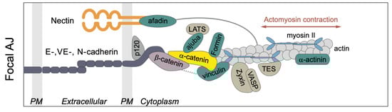 - Huveneers, S.; de Rooij, J. Mechanosensitive systems at the cadherin–F-actin interface. J. Cell Sci. 2013, 126, 403–413. [Google Scholar] [CrossRef] [PubMed]
