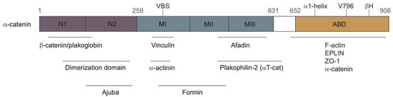 The most thoroughly-studied mechanosensitive protein in an AJ is -catenin [73,74,75]. It can bind both F-actin and -catenin, and under tension it can undergo an “unfurling” change in conformation which exposes cryptic binding sites for Vinculin, actin, and Jub. As shown in Figure 7, -catenin contains three domains: