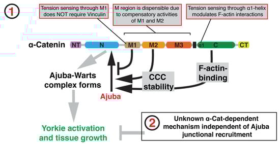 - Sarpal, R.; Yan, V.; Kazakova, L.; Sheppard, L.; Yu, J.C.; Fernandez-Gonzalez, R.; Tepass, U. Role of α-Catenin and its mechanosensing properties in regulating Hippo/YAP-dependent tissue growth. PLOS Genet. 2019, 15, e1008454. [Google Scholar] [CrossRef] [PubMed]