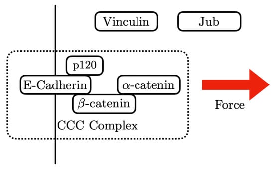 - Rauskolb, C.; Cervantes, E.; Madere, F.; Irvine, K.D. Organization and function of tension-dependent complexes at adherens junctions. J. Cell Sci. 2019, 132, jcs224063. [Google Scholar] [CrossRef] [PubMed]