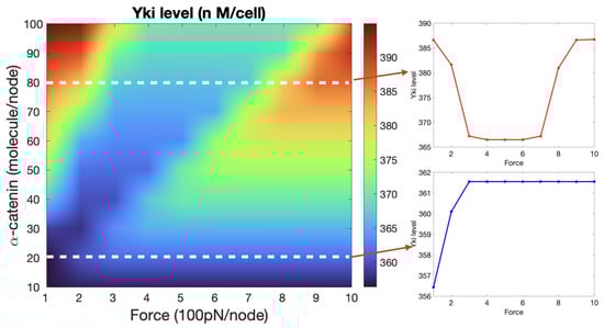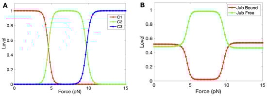 In the following computations, we hold all components in Figure 9 but -catenin constant and vary the forces to determine the steady state levels of the three states. At zero force, was open to Jub binding, but as the force increased, -catenin started unfolding from its initial (fully folded) state (Figure 10A), and exposure of M1 led to inhibition of Jub binding. A crossover between the decreasing state and the increasing state occurred at a force of ≈4.5 pN. A similar crossover from M1 into the M2 and M3 unfolded states occurred at ≈10 pN, which accords with the experimental result [87]. Furthermore, the time for this simple module to reach a steady state was around 2∼4 s, which also accords with the experimental result [87]. Figure 10B shows how the bound and unbound Jub depended on the force. The level of bound Jub was largest when the force was large and at its second largest when the force was small. In the range from 5 pN to 9 pN, where the M1 region was unfolding, the amount of bound Jub was lowest because M1 inhibited Jub binding.This quantifies more precisely the known result that the amount of bound Jub varies with the level of force [74,88].