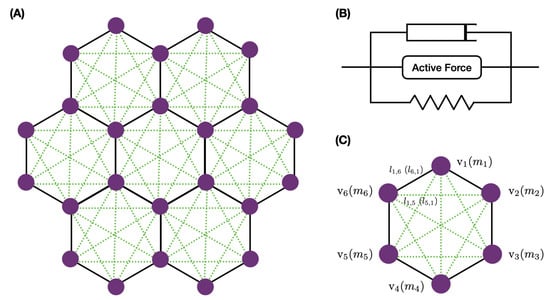 Here, M is the diagonal matrix whose entries are the masses of the nodes, is the vector of the spatial positions of the nodes in , is the rest length of the springs, is the vector of spring extensions, () represents the diagonal matrices whose entries are the elasticity coefficients for the belt connections (transverse connections), and is the matrix of damping coefficents for the viscous response. When all nodes have the same properties, the matricies , and are replaced by constants. The term represents the active force, and represents an externally imposed force. Details for these and other terms in Equation (4) are given in Appendix A.3.