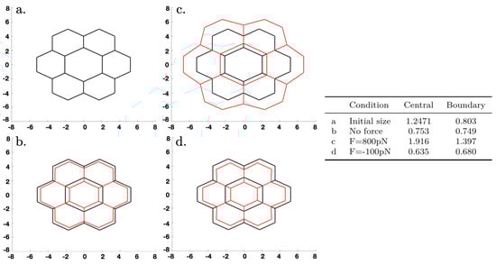 We studied a small network of cells—a central cell and six neighbors, as shown in Figure 12A—to understand how stress and imposed growth interact at the single-cell level. All cells were equal-sized hexagons initially, and we prescribed the elements in each cell as shown. The nodes received forces from the belt connections in the network and transverse forces from other nodes in their cell that reflected the actin network attached to the apical membrane. How the forces were computed is described in Appendix A.3.