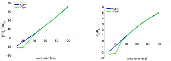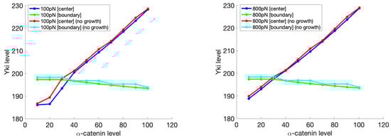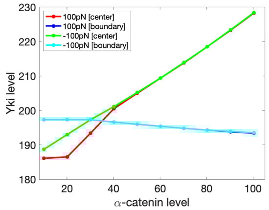 The actin nucleating and branching protein complex Arp2/3 is also found at AJs. It is believed to be necessary for AJ stability and formation by creating protrusive actin networks that push the AJ complexes on opposite cells together [62,71]. It was also found that the apical Crumb/Ex/Kibra/Mer complex responds to mechanical strains. When the apical area of the Drosophila follicular epithelium was stretched, reduction of the concentration of these complexes was observed, which in turn activated Yki activity [72]. But because the dynamics of Crumb, Kibra, and Mer, as well as their interactions with Ex are not considered in the current model, we assume constant inputs from these components in response to mechanical stretches and study the mechano-effect of adherens junctions separately.
