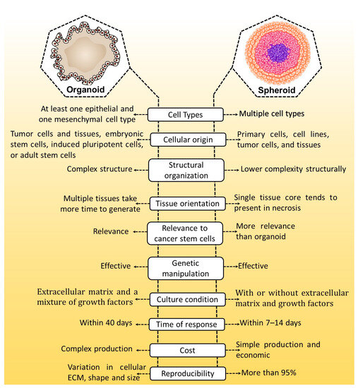 Three-dimensional cell cultures can be used as a substitute for laboratory organisms, reducing the need for animal testing, and toxicity levels for specific 3D cell cultures are similar to those in animal studies [14,15,16]. Various 3D models, such as spheroids, tissue explants, and organoids, have been developed [17]. Spheroids, normally cultured as free-floating aggregates of spherical cellular units, are considered to have a low level of complexity in mimicking the structure of tumors. Additionally, cellular spheroids have distinct cell phenotypes that match the structure of actual tumors, such as necrotic, proliferating, and non-proliferating cells [18]. The earliest evidence of cellular spheroid formation was discovered in 1944 by Holtfreter, while in 1970, Sutherland and coworkers developed a methodology for culturing spheroid cells [19,20]. Several strategies for creating cellular spheroids have been established thus far. The primary condition for forming cellular spheroids is that cell-to-cell adhesion must be higher than cells to substrates [21]. Organoids are 3D-grown cells with structural units that resemble the structure and function of organs in vivo [22]. Three-dimensional cultures can be established with or without the support of an ECM scaffold. Organoid and spheroids culture models serve distinct and complementary objectives, with differences in tumor cell sources, culture techniques, and formation time. Organoids can be cryopreserved and cultured for an extended period. Genetically and histologically, organoids can mimic the original tissue. Additionally, organoids are susceptible to genetic manipulation and can be produced from tiny amounts of tissue [23,24]. These features make them applicable to various applications in cancer research, including drug development, carcinogenesis research, and personalized treatment. The properties of organoid and spheroid are depicted in Figure 1.