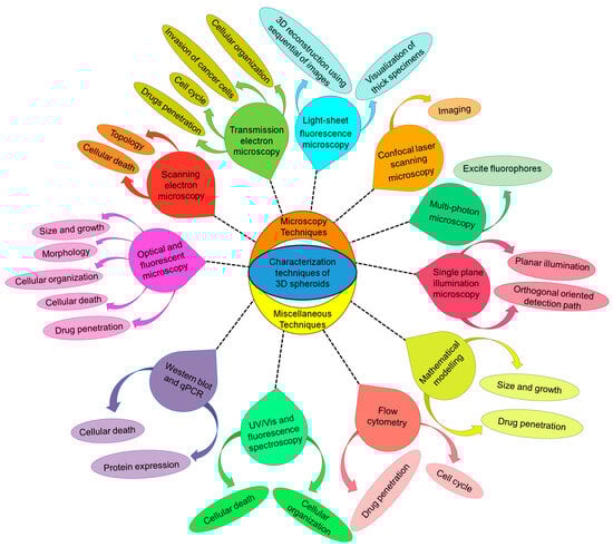 Different techniques have been explored for the establishment of histological analysis of 3D tumor spheroids, such as optical and electron microscopy, flow cytometry and Western blotting, ultraviolet–visible spectroscopy (UV/Vis) and fluorescence spectroscopy, UV/Vis and fluorescence spectroscopy, multi-photon microscopy, and confocal laser microscopy (Figure 2).