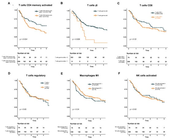 Kaplan−Meier curves show disease-free survival in HPV-negative HNSCC. The cohort is stratified by levels of immune cell subtypes that were significant in the univariate analysis (A, T cells CD4 memory activated; and B, T cells γδ) or have previously been associated with survival in HNSCC (C, T cells CD8; D, T cells regulatory; E, macrophages M1; and F, NK cells activated).