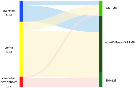 In contrast to previous retrospective neuroradiological studies that indirectly correlated tumor location to the molecular group of MB and addressed only vague data on surgical inspection [24,25,26,27], the present study is the first that systematically assessed detailed intraoperative observations regarding the site of origin and correlated those to the molecular group in a selected group of MB patients.