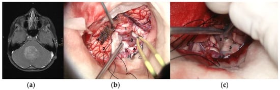 To date, the standard of care for MB in children consists of gross total resection, followed by radiotherapy and chemotherapy in children over the age of three years [6,7]. During surgery, most neurosurgeons generally tend to aim for gross total resection whenever possible, although there is insufficient definitive evidence that maximizing the extent of resection is associated with improved progression-free survival and overall survival [8]. As MB is inherently situated in an area that harbors vital neurological functions, neurosurgeons are often confronted with the decision to either attempt gross total resection or preserve neurological function with the risk of impacting the patient outcome [9]. Intraoperatively, the knowledge of the molecular group would add valuable information to optimize and tailor the neurosurgical strategy to the prognostic profile of the patient. While several studies attempted to analyze imaging characteristics of the molecular groups [10,11,12,13,14,15,16,17], growth characteristics of MB groups have rarely been described from a neurosurgical perspective.