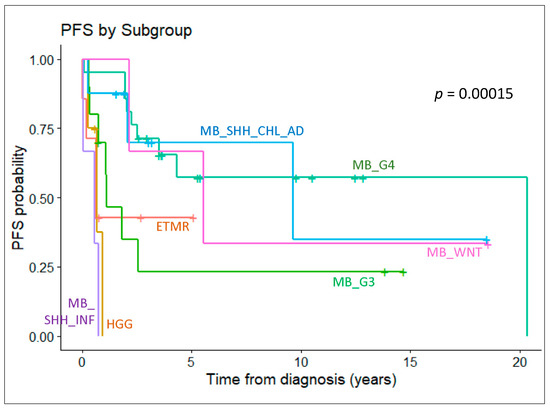 Survival analysis depicting the progression-free survival of patients with key molecular entities defined by methylation profiling. Drastic differences in outcome are observed among those with different subgroups of medulloblastoma.