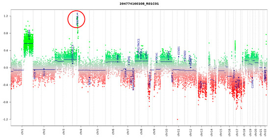 Copy-number analysis based on methylation data indicates a high level of PDGFRA amplification (red circle) in a sample reclassified as high-grade glioma.