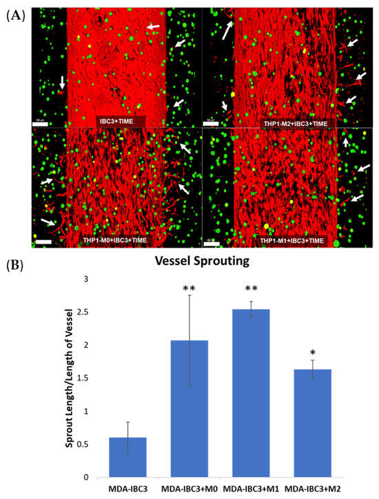 Confocal images of in vitro vascularized breast tumor platforms consisting of MDA-IBC3 cells (green) and within a collagen matrix surrounding a vessel seeded with TIME cells (red). These platforms incorporate the presence or absence of M0, M1, or M2 THP-1 cells. Arrows highlight newly formed vessel sprouts; scale bar: 100 µm (A), and quantification of vessel sprouting is represented as sprout length/length of vessel (B), * p < 0.05, ** p < 0.01.