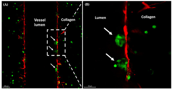 Confocal images of MDA-IBC3+M0 in vitro IBC platforms. Arrows indicate MDA-IBC3 cells (green) crossing the endothelium (red) (A); magnified view of the area in the outlined box (B).