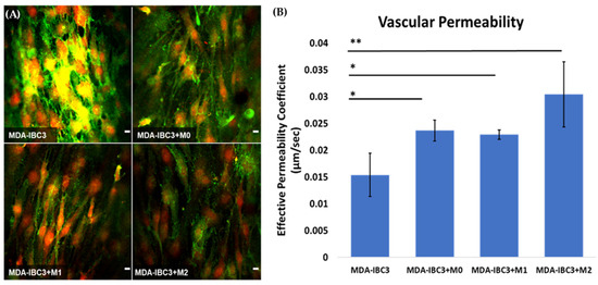 Assessing the impact of macrophage-tumor-vessel interactions on endothelial barrier function using two measurements: (A) visualization of the endothelial barrier with PECAM-1 (green) staining with DAPI (red) staining of cell nuclei for analyzing cell–cell junction between neighboring TIME cells, (B) quantification of the effective permeability of the endothelial barrier based on dextran permeability measurements (* p < 0.05, ** p < 0.01). Scale bar: 10 µm.