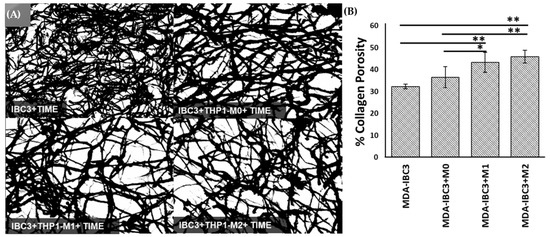 Collagen in tissues presents a physical barrier to tumor cell migration and invasion [49]. However, collagen degradation can lead to an increase in porosity, permitting collective tumor cell migration and intravasation. Collective cancer cell migration refers to the coordinated movement of groups of cancer cells as they invade surrounding tissues and spread to distant sites. In IBC, collective cancer cell migration is particularly relevant due to the unique clinical presentation of the disease [50,51,52]. The analysis of porosity based on scanning electron microscopy (SEM) images in Figure 4 demonstrated the impact of THP1 macrophages on matrix remodeling. Platforms containing THP-1 M1 or M2 macrophages exhibited significantly higher porosity compared to platforms with THP-1 M0 macrophages and those consisting of MDA-IBC3 cells alone. M2-conditioned macrophages in the MDA-IBC3+M2 platform led to the highest increase in matrix porosity over MDA-IBC3 alone, with a 1.5-fold increase (p < 0.01), followed by the M1 macrophages in the MDA-IBC3+M1 platform with a 1.3-fold increase over MDA-IBC3 (p < 0.01). While the matrix porosity in the MDA-IBC3+M0 platform had a higher mean porosity compared to MDA-IBC3, it was not found to be significant, highlighting the importance of macrophage phenotype in matrix remodeling.