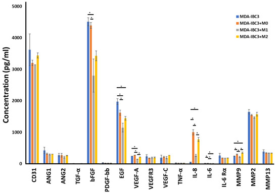 Cytokine measurements on the circulating media collected from perfusion outflow after 78 h of graded flow protocol in MDA-IBC3, MDA-IBC3+M0, MDA-IBC3+M1, and MDA-IBC3+M2 using Luminex assay, * p < 0.05.
