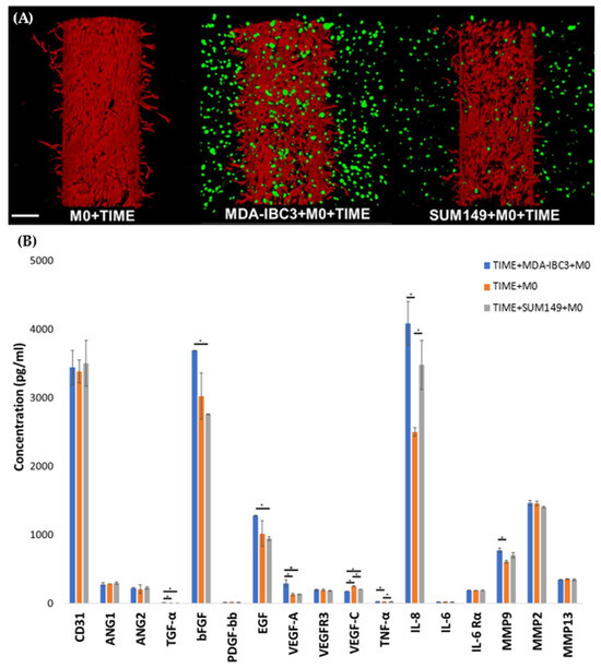 (A) Confocal images of in vitro vascularized breast tumor platforms consisting of MDA-IBC3 cells, TIME cells, and SUM 149 cells, cultured with M0 macrophages. Cancer cells are depicted in green, while TIME cells are shown in red; (B) Cytokine measurements on the circulating media collected from perfusion outflow after 78 h of graded flow protocol in the TIME+MDA-IBC3+M0, TIME+M0, and TIME+SUM149+M0 and platforms using Luminex assay, * p < 0.05.