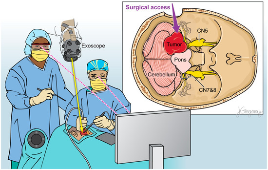 - Langer, D.J.; White, T.G.; Schulder, M.; Boockvar, J.A.; Labib, M.; Lawton, M.T. Advances in Intraoperative Optics: A Brief Review of Current Exoscope Platforms. Oper. Neurosurg. 2020, 19, 84–93. [Google Scholar] [CrossRef]