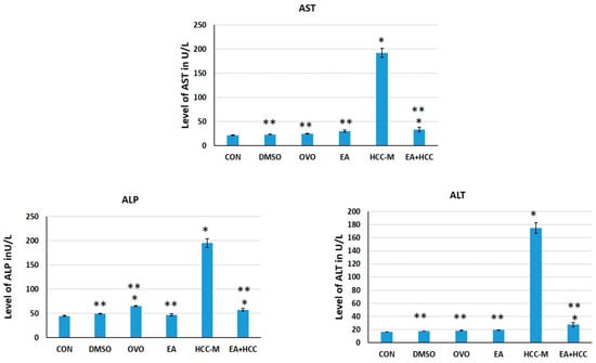 Bar graph showing levels of liver injury biomarkers, alanine aminotransferase (ALT) aspartate transaminase (AST), and alkaline phosphatase (ALP) in sera of all groups. Control (CON), (DMSO), olive oil (OVO), ellagic acid (EA), hepatocellular carcinoma model (HCC-M), and the HCC model treated with EA (EA + HCC). Data are presented as mean + SD. The mean difference was significant at level = 0.05; (**) significantly different from the HCC-M group at p ≤ 0.05; (*) significantly different from the CON group, p ≤ 0.05.