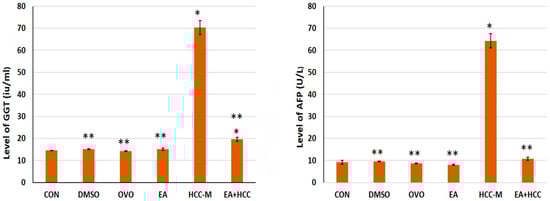Bar graph showing levels of tumor markers, gamma-glutamyl transferase (GGT), and alpha fetoprotein (AFP) in sera of all groups. Control (CON), (DMSO), olive oil (OVO), ellagic acid (EA), hepatocellular carcinoma model (HCC-M), and the HCC model treated with EA (EA + HCC). Data are presented as mean + SD. The mean difference was significant at level = 0.05: (**) significantly different from the HCC-M group at p ≤ 0.05; (*) significantly different from the CON group, p ≤ 0.05.