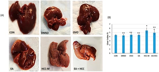 (A) Photomacrographs of livers from all groups. Control (CON), (DMSO), olive oil (OVO), ellagic acid (EA), hepatocellular carcinoma model (HCC-M), and the HCC model treated with EA (EA + HCC). A marked nodular surface of the HCC-M liver is evident which declined in the liver of group EA + HCC. (B) Bar graph showing the liver index % in all groups. Data are presented as mean + SD. The mean difference was significant at level = 0.05; (**) significantly different from the HCC-M group at p ≤ 0.05; (*) significantly different from the CON group, p ≤ 0.05.