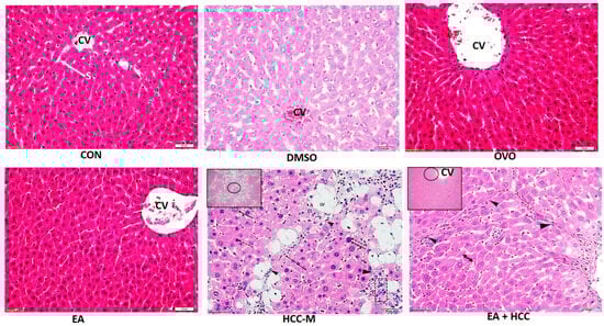 The microscopic examination of liver sections stained with H&E revealed a typical structural pattern—hepatocytes with vesicular nuclei radiating in rows from the central vein separated by sinusoids. The structure of livers from rats of CON, DMSO, OVO, and EA groups was indistinguishable except for slight central vein (CV) congestion in the DMSO group. Livers from rats of group HCC-M revealed distorted structures with eminent nodular division. Hepatocytes ballooned with lipid vacuoles of different sizes and arranged in plates of more than two cells. Nuclei were prominent, hyperchromatosed with an apparent increased nuclear-cytoplasmic ratio. Clusters of oval cells were also evident. In sections of livers from the EA + HCC group, general hepatic architecture was regained with hepatocyte plates arranged in one cell plate, and the prominent fatty change was almost abolished. However, the nodular pattern was still evident (Figure 4).