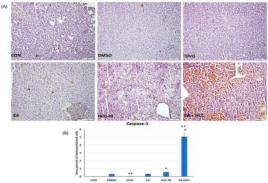 In this study, cells immunostained with caspase-3 were used to identify the final execution of apoptosis. There was a remarkable increase in the area percent of immunostained cells in sections of livers of group EA + HCC (5.07 ± 0.55) compared to the untreated group HCC-M (0.55 ± 0.042). Other groups (DMSO, OLO, and EA) did not show any significant difference from the CON (p ≥ 0.05) (Figure 5A,B).