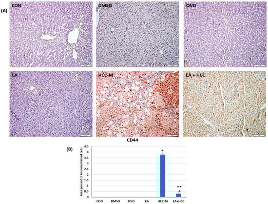 Photomicrograph of sections of livers immunostained with CD44 marking hepatic cancer stem cells (HCSCs) in different groups (A); control (CON), (DMSO), olive oil (OVO), ellagic acid (EA), hepatocellular carcinoma model (HCC-M), and the HCC model treated with EA (EA + HCC). Scale bar = 50 µm (B) bar graph representing the area percent of immunostained cells in all groups. Data are presented as mean + SD. The mean difference was significant at level = 0.05; (**) significantly different from the HCC-M group at p ≤ 0.05; (*) significantly different from the CON group, p ≤ 0.05.