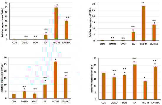 Bar graphs representing the relative expression of TGF-α, TGF-β, VEGF, p53 at m RNA level following the analysis of quantitative real-time PCR (qRT-PCR) in livers of all groups. Control (CON), (DMSO), olive oil (OVO), ellagic acid (EA), hepatocellular carcinoma model (HCC-M), and the HCC model treated with EA (EA + HCC). Data are presented as mean + SD. The mean difference was significant at level = 0.05; (**) significantly different from the HCC-M group at p ≤ 0.05; (*) significantly different from the CON group, p ≤ 0.05.