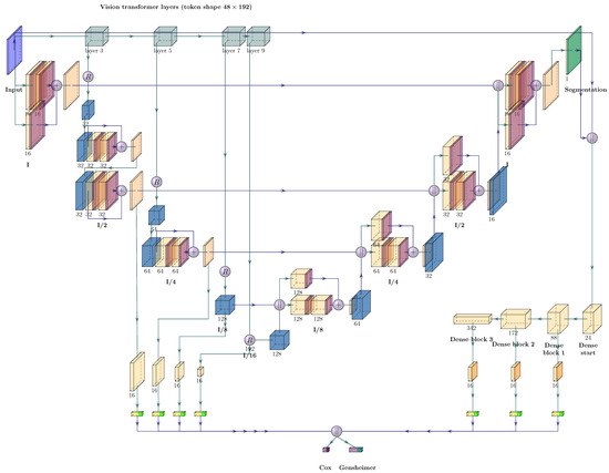 Our ViT architecture for simultaneous segmentation and outcome prediction was based on the UNETR design proposed for segmentation tasks by Hatamizadeh et al. [51]. It extends the UNet shape to work with ViT models as feature extractors. Compared to the reference implementation of the used ‘MONAI’ library (https://monai.io/ (accessed on 4 October 2023), version 0.8.1), we reduced the number of model parameters by using a ViT with 9 transformer layers instead of 12, with six self-attention heads and a dimensionality of 64 per head. We also reduced the latent dimensionality to 192 and used an MLP dimension of 768. The extension of this architecture to perform outcome prediction was achieved analogously to the case described for the UNet and is depicted in Figure 2. For outcome prediction, features were derived from all four downsampling blocks and optionally from the DenseNet component. Here, we used 16 features of each downsampling and DenseNet block, for a total dimensionality of 112 and 64 when the DenseNet was present and absent, respectively.