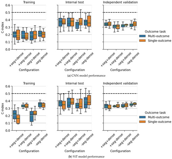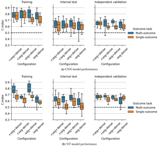 In future investigations, the multitask approach could be further extended through the introduction of additional auxiliary objectives, such as input reproduction through an autoencoder [28], the auxiliary prediction of handcrafted radiomics features [60] known to be prognostic for outcome, classification tasks, or the estimation of clinical patient attributes to guide learning of potentially relevant and humanly interpretable features. Similarly, further outcome heads could be introduced. We initially investigated the inclusion of two additional models into the multi-outcome setup: a fully parametric log-normal model [61,62,63] and one that directly optimized an approximation of the C-index metric [54]. Unfortunately, including either of these, we encountered numerical problems when training the neural networks, as undefined values were repeatedly produced. We, therefore, refrained from further exploring these options. This demonstrates that proper handling of multitask approaches can become difficult if too many tasks are incorporated that could interact and compete with each other in complex ways during model optimization. To further illustrate this, we found that while outcome predictive performance for multitask models was not negatively affected by the introduction of a DenseNet branch in most configurations, segmentation performance was noticeably reduced by its incorporation on both datasets, as shown in the boxplots of Supplementary Figure S6. The reason for this observation could likely be that the DenseNet branch, introduced to support the outcome prediction, led to a shift in focus towards the outcome prediction task and reduced segmentation performance. This was especially apparent for CNNs, as the DenseNet contained about three times the number of parameters compared to the plain UNet, a limitation of our initial architecture design. On the same note, we observed slightly improved segmentation performance for ViTs compared to CNNs in both cohorts, likely due to the much larger network size, but possibly also attributable to the incorporated self-attention mechanism, designed to allow for information exchange between non-local image neighborhoods and a better focus on smaller image details. These observations suggest that the main modeling objectives need to be clearly defined when planning multitask experiments, as it is unlikely that a model trained using a multitask paradigm will do equally well on all tasks. For our experiments, however, a drop in segmentation performance was not detrimental, as the focus was on outcome modeling and the segmentation objective was merely introduced as an auxiliary task to guide model training towards image regions containing tumor tissue. In general, different weighting strategies for the individual parts of the multitask loss function could be explored in future work, which might reduce such problems. Moreover, it might be worth exploring transitioning from multitask learning, where different objectives are scalarized into a single objective [64], to full-scale multi-objective optimization approaches that attempt to find Pareto optimal solutions for a vector of objectives [65,66].
