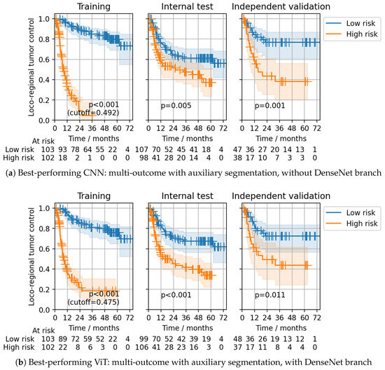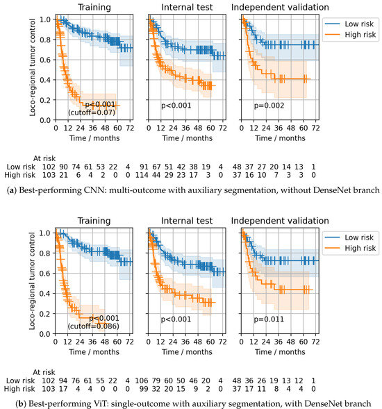 Model ensembling slightly improved the CPH model’s performance compared to the results obtained during CV. In line with the CV results, the best ensemble discrimination for the CPH head on the independent validation cohort was achieved using multi-outcome CNNs without the DenseNet branch, trained with auxiliary segmentation loss (C-index: 0.26 (0.18–0.34)) and single-outcome ViTs with the DenseNet branch, trained with auxiliary segmentation loss (C-index: 0.26 (0.18–0.35)) (Table 1). For both ensembles, statistically significant patient stratifications on the internal test and independent validation data were obtained (log-rank and 0.011, respectively) (Figure 5). The same multi-outcome CNN configuration that showed the best performance for the CPH head also achieved the best discrimination for the Gensheimer head at 24 months in independent validation (C-index: 0.74 (0.65–0.82)), as well as successful patient stratification (log-rank , Figure 6a). The corresponding single-outcome model ensemble performed considerably worse (C-index: 0.62 (0.52–0.72)). Multi-outcome ViTs with the DenseNet branch and with auxiliary segmentation loss also showed good discrimination (C-index: 0.72 (0.62–0.81)) together with significant stratifications (log-rank , Figure 6b). For ViTs, the gap between single- and multi-outcome performance was less pronounced.